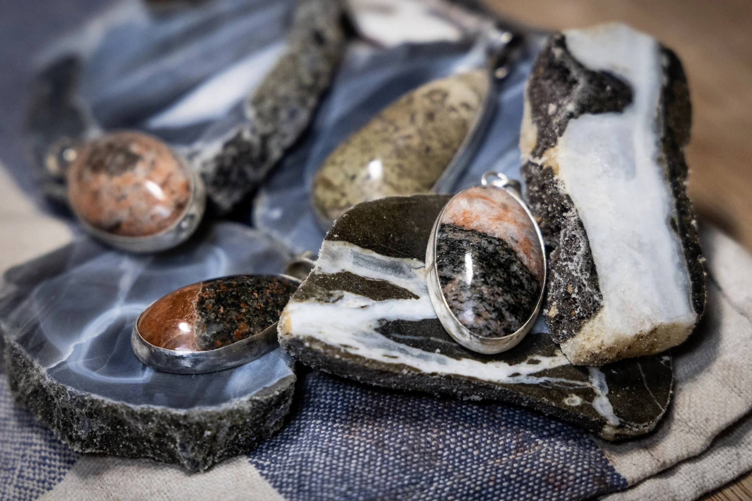 Hebridean stones, found in the wild - cut, polished and set in solid sterling silver by Willie